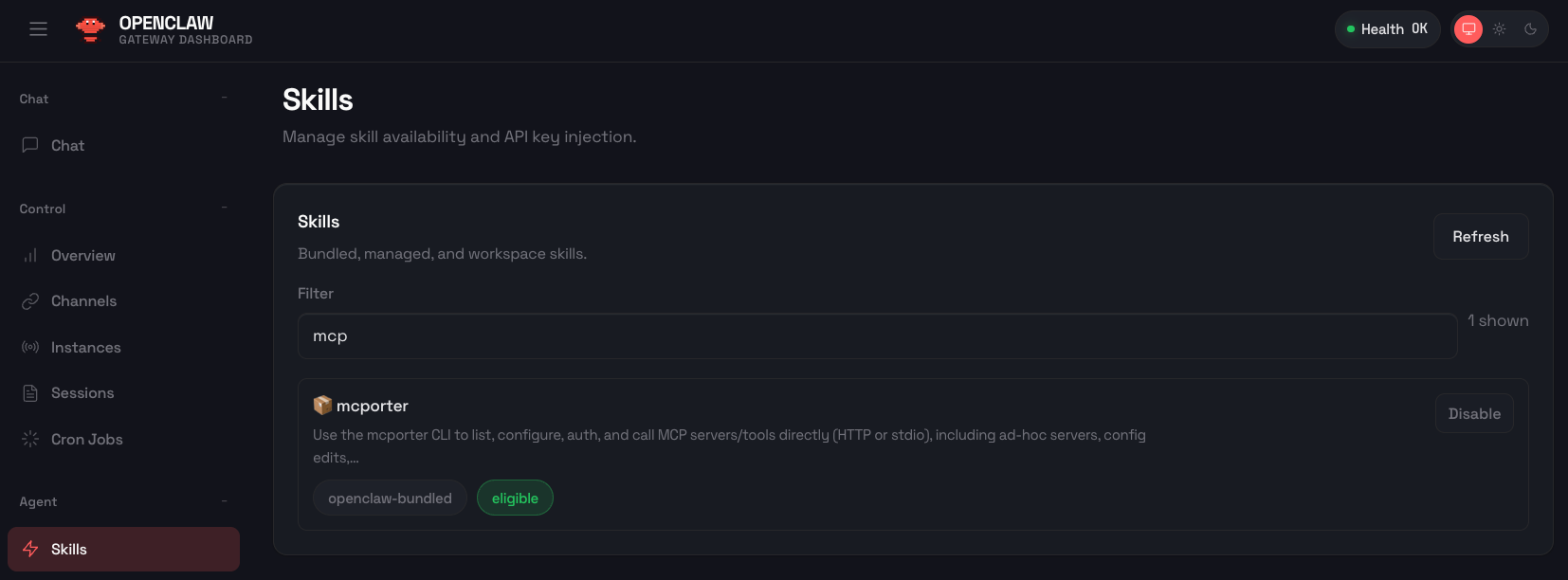 2, Enable MCPorter Skill on OpenClaw Dashboard:
