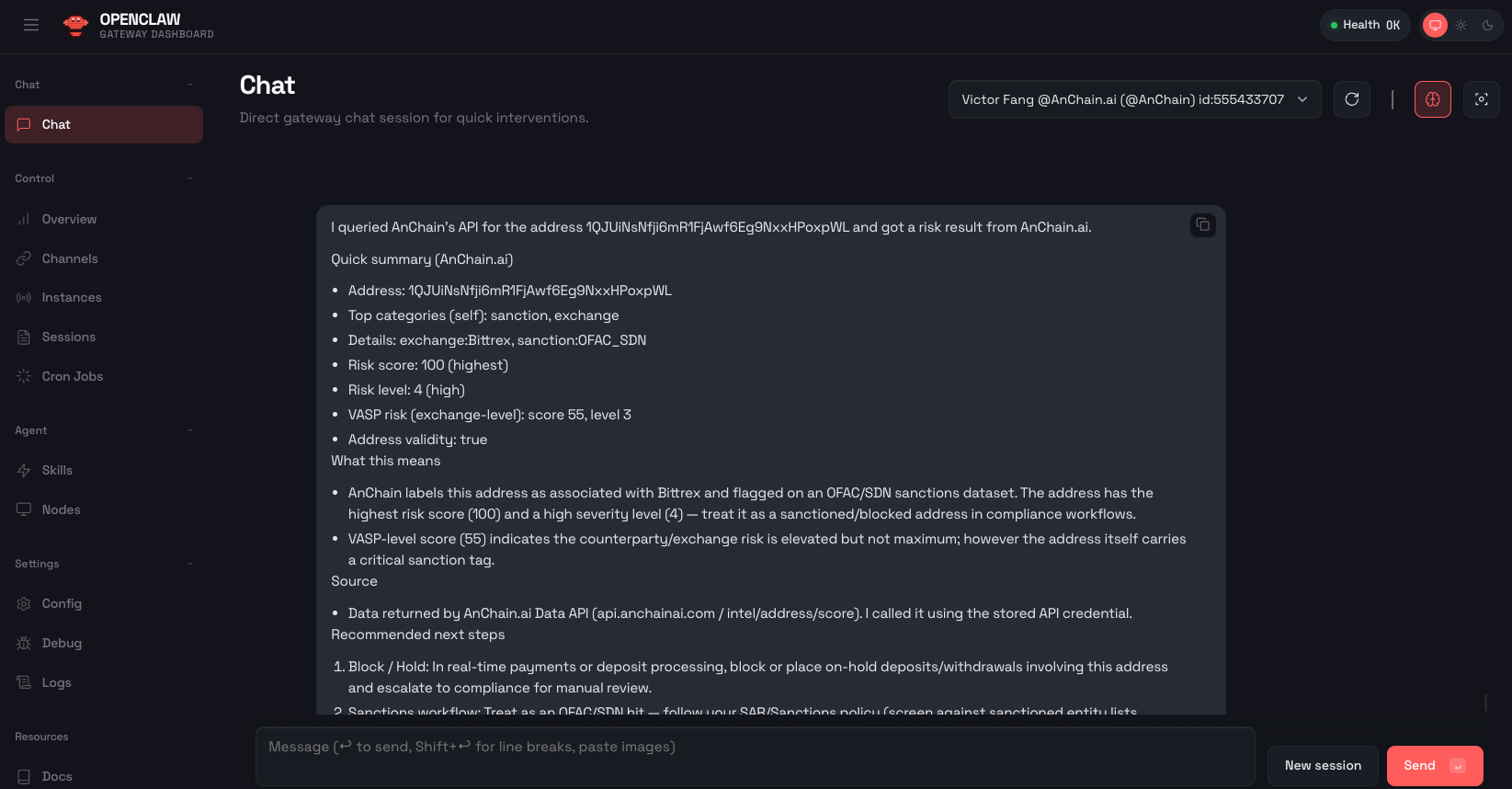 With the AnChain.AI Data platform integrated with your OpenClaw, you can do more tasks such as: