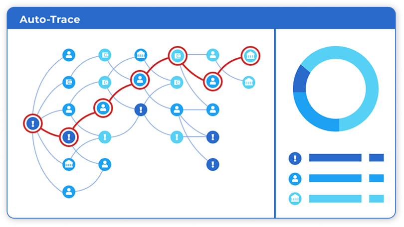 Follow complex money flows with AI-driven automation. Identify key paths, risky addresses, and liquidation points in seconds, reducing investigation time by 85% while maintaining full transparency.